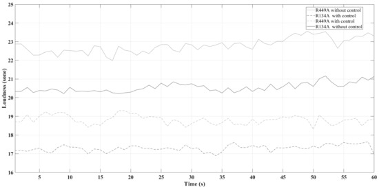 From Figure 7, it is also possible to see the effect of the control system. When the regulation is applied to the refrigeration system, the loudness dropped more than 3 sones. Moreover, the differences of the emitted loudness between R-134A and R-449A can be appreciated. This is almost 3 sones without control systems and 2 sones when the VFD are working.