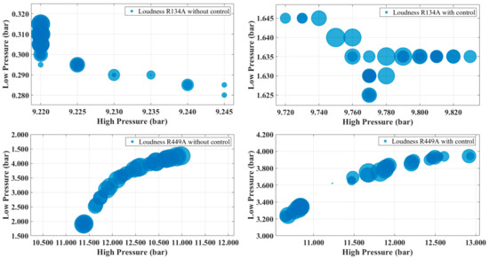The working pressures for R-449A and R-134A refrigerant gases can be seen in Figure 8. It is possible to see the relationship between both working pressures and loudness. Loudness is represented by bubbles; the higher the loudness, the higher the size of bubbles. Both low and high frequencies seem to be more constant for R-134A than R-449A, as well as loudness. In the case of R-449A, it is possible to observe that the loudness increases when the pressures rise, and the trend of the loudness is almost linear.