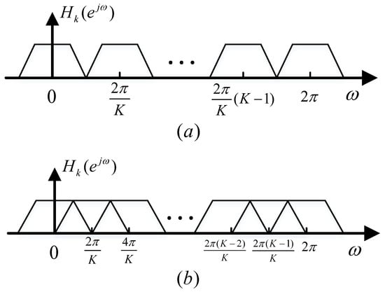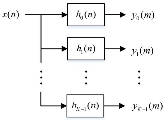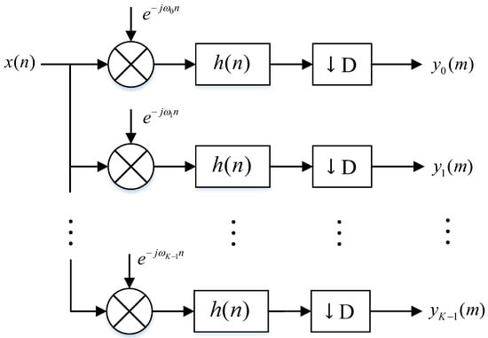 When the monitoring frequency band is evenly divided into K channels, the bandwidth of the filter bank output signal is . According to the Nyquist sampling theorem, the spectral structure of will not change even though is decimated by K times. A simple implementation of uniform channelization for the complex signal is shown in Figure 2 [], where the number of channels is K, the center frequency of each channel is , and the decimation factor is .