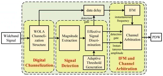 This section proposes a digital channelized receiver architecture for wideband low SNR chirp signal detection. A non-critical sampling channelization structure is adopted, eliminating signal spectral aliasing in the channel. An adaptive threshold generation algorithm is proposed to detect signals without prior conditions. A CORDIC-based IFM algorithm is proposed, improving chirp signals’ frequency estimation accuracy. Moreover, a channel arbitration logic is proposed to complete the cross-channel combination of wideband signals. The detailed flow of the proposed digital channelized receiver architecture is shown in Figure 4.
