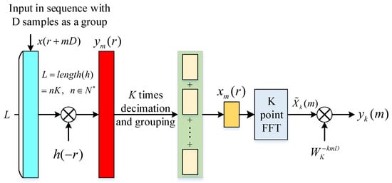 The WOLA channelization structure is obtained from the above process, as shown in Figure 5. The WOLA channelization structure implements the analysis window using a direct extraction structure, which improves the efficiency by D times. In addition, K filter channels share the same windowing process, increasing efficiency by a factor of K. Moreover, the FFT is efficient. The WOLA structure has no restrictions on the number of channels K and the decimation multiple D. Thus, the decimation multiple can be flexibly adjusted according to the frequency response of the prototype filter to ensure accurate frequency measurement with the lowest channel sampling rate.
