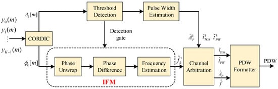 A functional block diagram of IFM and channel arbitration is shown in Figure 6. The magnitude and phase of the channel output signal are extracted by a coordinate rotation digital computer (CORDIC) algorithm. The output signal after the channelized structure is the complex signal. Define ; the instantaneous magnitude and phase are shown below [].