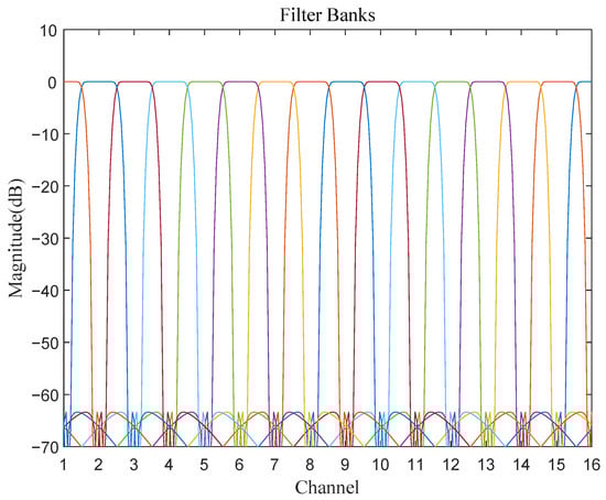 Figure 7 shows the realized magnitude response for filter banks. The number of output channels is . As shown in Figure 7, it is clear that there is no blind zone for the signal interception in the receive bandwidth. In addition, oversampling ensures no aliasing of the signal spectrum within the channel.