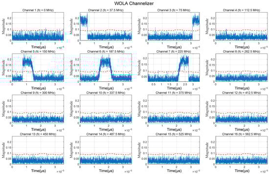 The WOLA channelization results. (The blue line indicates the instantaneous amplitude of the signal in the channel, and the red dashed line indicates the detection threshold).