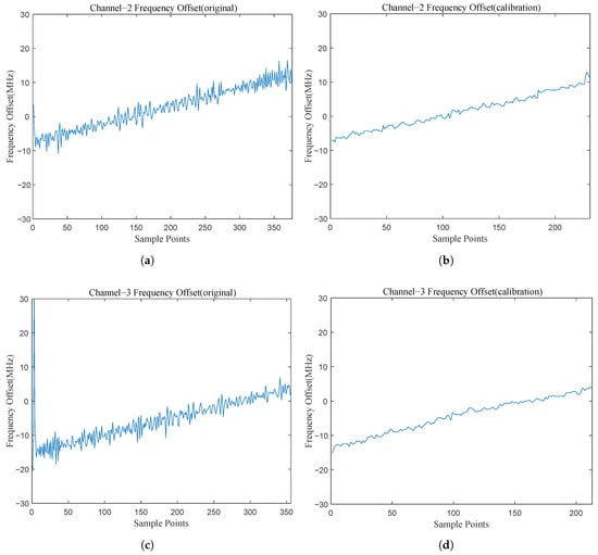 The instantaneous frequency measurement (IFM) results of the correct Channel 2 and 3: (a) the original IFM result of Channel 2; (b) the calibrated IFM result of Channel 2; (c) the original IFM result of Channel 3; (d) the calibrated IFM result of Channel 3.