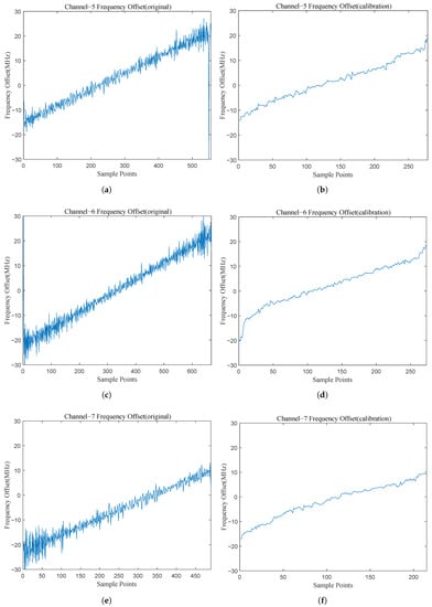 The IFM results of the correct Channel 5, 6, and 7: (a) the original IFM result of Channel 5; (b) the calibrated IFM result of Channel 5; (c) the original IFM result of Channel 6; (d) the calibrated IFM result of Channel 6; (e) the original IFM result of Channel 7; (f) the calibrated IFM result of Channel 7.