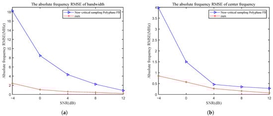 The absolute frequency root-mean-square error (RMSE) of bandwidth and center frequency with different SNR: (a) the absolute frequency RMSE of bandwidth; (b) the absolute frequency RMSE of center frequency. (The blue line indicates the results of the Refs. [,]; The red line indicates the results of the algorithm proposed in this paper).
