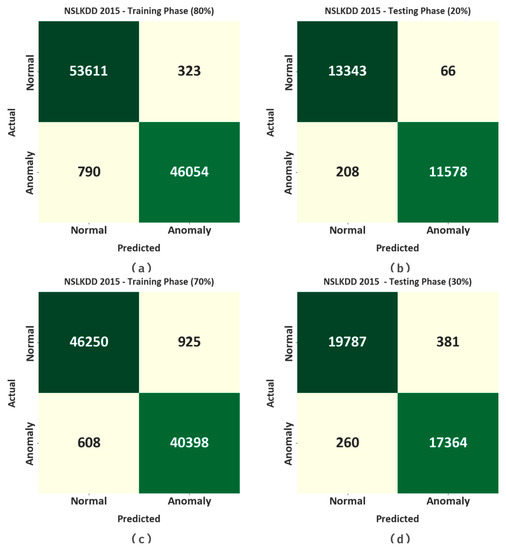 Confusion matrices of XAIID-SCPS system on NSLKDD2015 dataset (a,b) TRS/TSS of 80:20 and (c,d) TRS/TSS of 70:30.