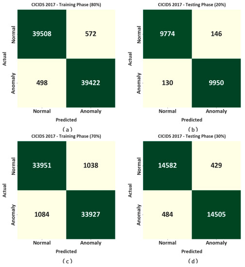 Confusion matrices of XAIID-SCPS system on CICIDS 2017 dataset (a,b) TRS/TSS of 80:20 and (c,d) TRS/TSS of 70:30.