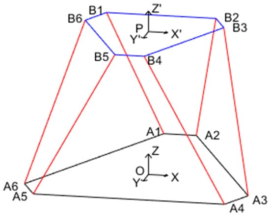In order to study the kinematics relationship of the parallel platform, the mechanical structure of the parallel platform is abstracted mathematically, and the spatial geometric model is established. With the center of mass, , of the static platform at the bottom of the parallel platform as the origin, a space Cartesian coordinate system, , is established. With the center of mass, , of the top moving platform as the origin, a space rectangular coordinate system, , is established. Simplify the mechanical structure of each mechanical arm of the parallel platform and the upper and lower platforms. Establish the parallel platform space geometric model in MATLAB, as shown in Figure 1.