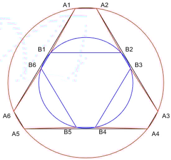 A1 to A6 in Figure 1 are the connection points between the bottom static platform and each parallel manipulator arm. B1 to B6 are the connection points between the top moving platform and each group of parallel mechanical arms. The six connection points B1 to B6 of the top moving platform and the mechanical arm are on the same circumscribed circle. The six connection points A1 to A6 of the bottom static platform are on the same circumscribed circle. In the initial zero state, the six robotic arms are of equal length, and the centers of the circumscribed circles of the moving platform and the static platform coincide. Figure 2 shows the top view of the parallel platform in the initial zero state.