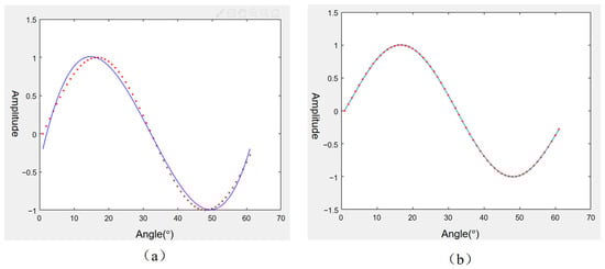 According to the Weierstrass polynomial approximation theorem, any continuous function, , on the closed interval can be expressed as a uniformly convergent limit of a polynomial sequence [27]. To have an intuitive understanding of this theoretical thought, in MATLAB, use the cubic polynomial regression curve and the quintic polynomial regression curve to approximate the sin function curve; the effect is shown in Figure 3.