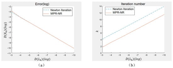 Both and in Figure 5a are logarithmic images with base 10. It can be seen from Figure 5a that and of the two algorithms present a positive linear relationship. Therefore, every time the stop condition, , increases by an order of magnitude, the accuracy of the kinematics positive solution, , also increases by an order of magnitude. It can be seen from Figure 5b that has a negative linear relationship with the number of iterations of the two algorithms, and the slopes of the two algorithms are similar. Therefore, it can be considered that in the second test sample set, the MPR process in the MPR-NR algorithm is equivalent to completing 2.41 Newton iterative algorithms.