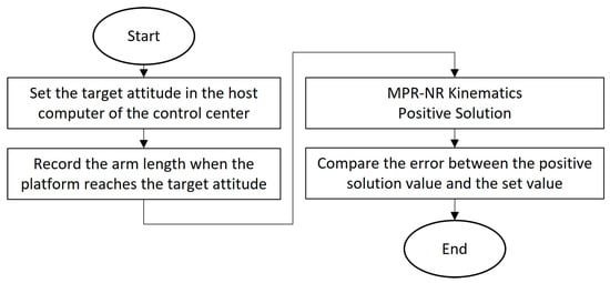In order to further verify the correctness and stability of the MPR-NR algorithm running in the parallel platform system, a kinematics positive solution experiment based on the physical platform was designed in this research. For parallel platforms, the kinematics inverse solution is relatively simple. The parallel platform can be moved to a specified attitude by adjusting the length of each group of robotic arms to achieve a closed-loop attitude. The experimental process is designed as follows: The parallel platform is adjusted to the specified attitude in the workspace through the attitude closed-loop control method. Record the arm length information fed back by each servo driver when reaching the target attitude. The length information of the manipulator is imported into the MPR-NR algorithm of the MATLAB platform to calculate the kinematics positive solution. Compare the calculation results with the attitude of the parallel platform physical setting. Through this method, the closed loop from the attitude of the parallel platform to the length of each group of manipulators and then to the attitude of the algorithm simulation can be completed. Then compare the attitude of the parallel platform calculated by the MPR-NR kinematics forward solution algorithm with the attitude of the real object. It can be confirmed whether the algorithm can run as theoretically expected. The experimental process is shown in Figure 6.