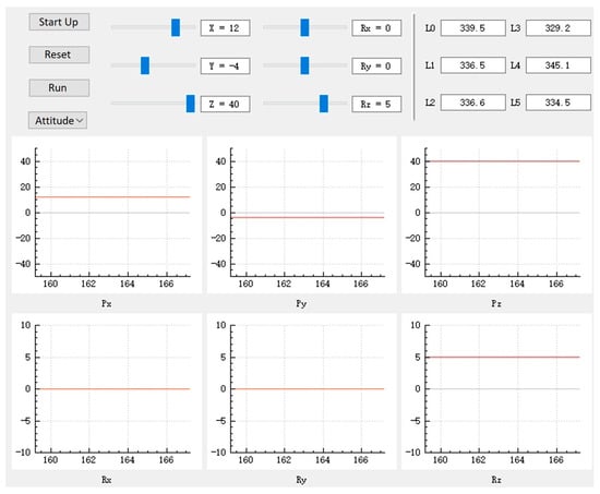 In the host computer of the parallel platform control center, set the target attitude of the parallel platform in the workspace as . The unit of displacement in the MATLAB algorithm is meter, and the unit of angle is radian. Therefore, unit conversion is required when comparing parameters. The converted target attitude value is . Click the run button in the host computer and wait for each driver to complete the length adjustment of the mechanical arm. Make the parallel platform run to the set target attitude. The length information of each robot arm when the upper computer of the control center performs in the closed-loop attitude is shown in Figure 7.