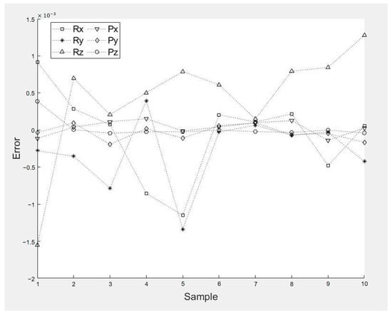 It can be seen from Figure 8 that the angle error is in the order of 10−3, and the displacement error is in the order of 10−4. Therefore, the correctness of the operation of the MPR-NR algorithm can be proved. The main reason for the error is that the length value of the robotic arm shown in Figure 7 retains only one decimal place after the decimal point, resulting in a truncation error.
