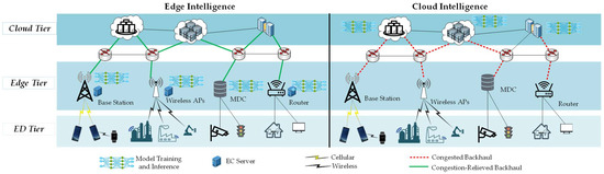 With the proliferation of IoT, data-driven AI solutions are applied for (1) handling the enormous data features and heterogeneous IoT taxonomies, (2) analyzing the underlying hidden patterns of structured, semi-structured, quasi-structured, and unstructured data, and (3) making reliable decision outcome in terms of classifications, predictions, and recommendations [17,18]. To make this solution sufficient in real-world applications, the development process has to consider computational resource placement, leading to the confluence of AI with adequate cloud computing and EC capacities, known as cloud intelligence (CI) and EI, respectively [19]. Figure 1 illustrates the overview between CI and EI, each of them consisting of three primary tiers: end devices (ED), edge, and cloud. In CI, model training and inference are performed in central cloud servers, which raised various challenging drawbacks while gathering the local data, including backhaul congestion, high latency, privacy leakage, and insufficient bandwidth consumption.