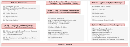 The rest of the paper is structured as follows (Figure 2). Section 2 outlines the preliminary studies on FL and DRL. Section 3 discusses the correlations between DRL and FL. Section 4 discusses the promising DRL-based enabler optimization approaches for an efficient FL (eFL) framework in massive IoT. Section 5 provides a wide taxonomy of IoT application deployment strategies using DRL/FL. The challenges and future perspectives are highlighted in Section 6. Finally, Section 7 concludes our paper.