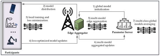 Edge FL consists of edge aggregator orchestration to reduce the number of direct round communication between local participants and server, which is significant for communication-critical and computation-limited IoT clients. There are complementary studies to be outlined in this subsection for analyzing the deployment applicability of edge FL in massive IoT. Edge FL leverages the EC resources for enabling a converged beneficial factor of FL and edge computation offloading [44,45,46,47]. A three-tier architecture between participant, edge, and central FL allows the round communications of participant updates and global aggregation to be client-edge and edge-cloud, respectively. To improve client-specific service, each label can aggregate within the distributed edge server for understanding the service efficiency and alleviating unimportant client–cloud communications. The layers of the defined model are separated for co-training between selected participants and edge servers. The computation-intensive and lightweight layers are operated in edge entities and local devices, respectively. Therefore, the upper-bound execution time of FL training expectation is decreased and acceptable for practical use cases. Figure 3 shows the primary procedures of edge FL, including (1) global model initialization from the parameter server, which is executed in the edge cloud, (2) global model distribution, which is executed in the client–edge tier, (3) local training and loss minimization, which are co-processed between client and edge, (4) loss-optimized local model updates based on labels, (5) multi-model edge aggregation at edge tier, (6) multi-model aggregated updates between edge and cloud, and finally, (7) multi-class global models averaging for the next iteration.