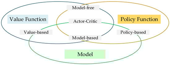 Markov decision process models an optimization problem with four-tuple components, namely , which represents the set of states, actions, rewards, and transition probability [53,54]. At a particular time , state represents the characteristic features of the environment, which are observed for feeding the agent. Action consists of the updating parameters or configuration settings that the agent applies for purposes of improving the state condition. Within general DRL, is selected by function approximator using DNN. By modified DRL configuration (e.g., deep Q-networks), function approximators can be split into two primary networks, namely online and target. The separation procedure prevents an error of overoptimism. In the experience replays, denoted as , the agent feeds for current loss optimization and for q-maximized action approximation. Over numerous iterations of exploration and exploitation, the non-optimal or near-optimal values are iteratively altered through the gradient process. Eventually, the optimal agent policy will be obtained. In every defined step, the weights are exchanged between online and target networks. To evaluate how well action is applied in state , the agent used the reward function that was formulated by the specific performance targets for the state–action pair. The transition probability indicates the estimation after configuring into , then transits the environment into . To classify the diversity of DRL types, Figure 4 lists the differences between used/unused criteria (e.g., value, policy, and model).
