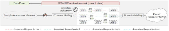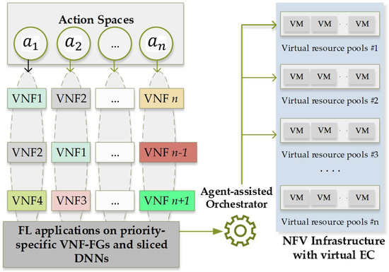 SDN and NFV are well-known for enabling elastic and virtual network services, which greatly help in adopting the next-generation FL architecture in massive IoT services. Figure 6 illustrates the architecture of decoupled SDN planes with NFV-enabled edge resources to distribute sliced DNNs for softwarized FL-based service controllers. FL applications can be virtualized and instantiated as network services/functions within a set of VNF forwarding graphs (VNF-FGs). This way introduces the elasticity of FL deployment in the future by leveraging the flexibility of flow rule installations/modifications and VM placement within VNFs. FL services can be modified by providers in real time with the expected quality assurance. Figure 7 shows the interactions of DRL-based orchestration by configuring the actions that control the resource properties on VNF instances. Multi-service FLs are linked to efficient VNFs and VM resource pools in EC-enabled NFV infrastructure. To deal with the heterogeneity of IoT taxonomies and services, [71] presented a graph neural network (GNN) and DRL-assisted efficient VNF-FGs placement in SDN- and NFV-enabled IoT environments, which provided a great lesson on the applicability of modifying the FL-based IoT services to be optimized via a DRL-based algorithm. The states of resource capacities and actions on link placement are correlated in NFV-enabled FL service deployment. Furthermore, in [72], a hierarchical DRL that relied on the GNN algorithm was extensively studied for improving resource management for efficient service chain control. The lower- and upper-level DRL were designed for minimizing the resource utilization and blockage probability, respectively. The collaboration between lower and upper levels greatly assists the training execution and outputs a cost-efficient policy.