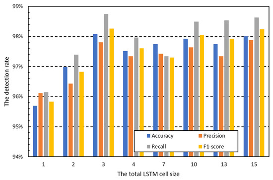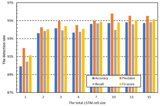 The results of this experiment confirmed that the highest F1-score was achieved when only the output of the last cell was used in both the training and test datasets. Therefore, according to the experimental results, the proposed method was designed to use only the output value of the last cell of the session classifier. The final output value was provided as an input to the DNN, and the output of the final DNN determined whether to invade. This method has several advantages. First, the overall structure of the classifier is simplified and the classification speed is increased. In addition, when packets being processed belong to one session, memory space can be saved because it is not necessary to store the output result of the cell for the mid-session packet of the session classifier.