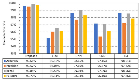 Figure 13, are also very similar to those for the ISCXIDS2012 dataset. Although the performance of DNN was the best among comparison methods, it was 1.39% lower than the proposed method in terms of the F1-score. The proposed method exhibited consistently high performance for all metrics. Therefore, regardless of the type of dataset, it exhibited a higher detection rate than other methods while keeping false positives and false negatives low.