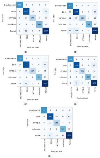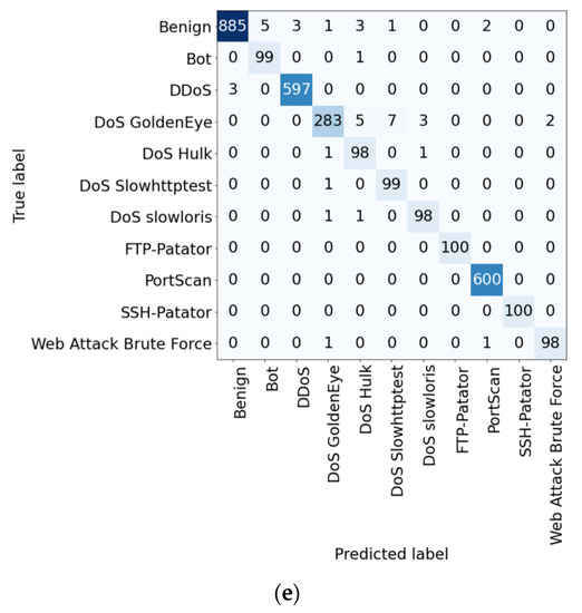 Figure 16 shows that HTTPDoS detection accuracy is very high compared to other NIDSs. Considering that DoS attacks are difficult to distinguish from normal traffic, the high accuracy of HTTPDoS detection means that the proposed NIDS accurately classifies even similar classes. It can be reconfirmed that the sophisticated structure of the deep learning model and the approach to generate features using all packet data are very effective in enhancing the detection performance of NIDS.