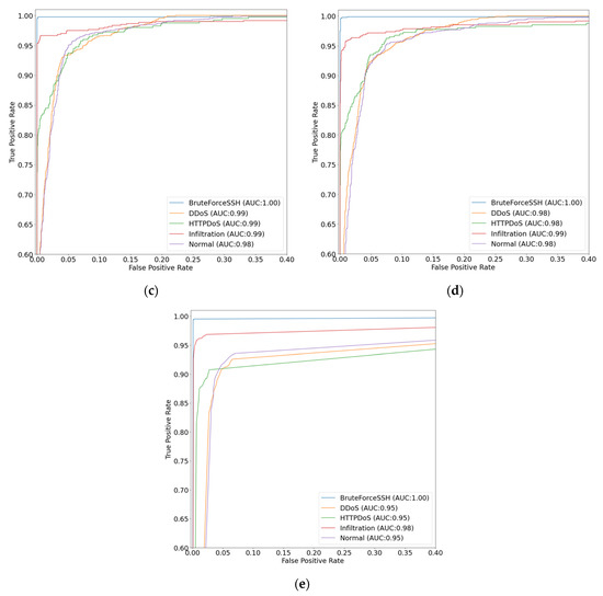 In particular, it can be seen that the detection accuracy for normal traffic is the highest in the ROC curves. The highest detection accuracy for normal traffic means that the proposed NIDS has the lowest negative impact on normal traffic for users. In addition,