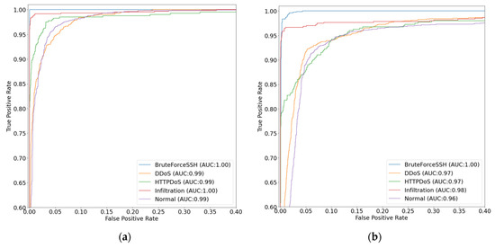 Figure 16 and Figure 17 show the receiver operating characteristic (ROC) curves for each dataset [28]. Regardless of the dataset, the performance on each class was superior to the existing algorithms. This confirms the superiority of the proposed method in terms of the overall performance and performance of each class compared to existing algorithms in various environments.