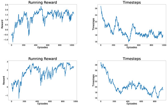 Figure 3 shows the number of steps taken to reach the unoccluded state and the rewards received by the agents. Note that the training was successful, since both RL agents were able to learn the solution of the given problem and avoid occlusion in a relatively low amount of steps.