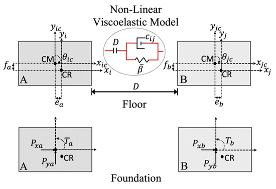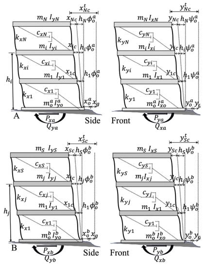 Subscripts and in Figure 1 indicate the numbers of stories in the buildings. These are for Building and for Building . In this study, the following values have been determined: the mass, stiffness, damping coefficients, and moment of inertia of the floor with respect to the axes parallel to the and axes of Building and in relation to the center of mass. In addition, Buildings and are represented either by the subscript or superscript and , respectively. A building with stories has DOF; hence, Buildings A and B have and equations, respectively. Here, only the equations for Building are highlighted. The equation of motion noted from previous studies [30,35,42,43,44] is briefly presented herein for completeness. The three equations of motion of each floor of the building may be written in a matrix form as (3 N):