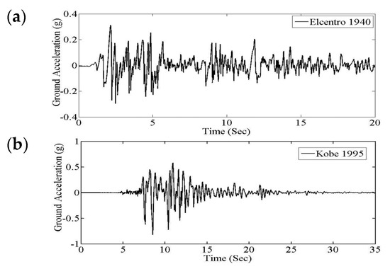 (a) 1940 El Centro and (b) 1995 Kobe earthquakes with maximum ground acceleration scaled to 0.3 g and 0.8 g, respectively.