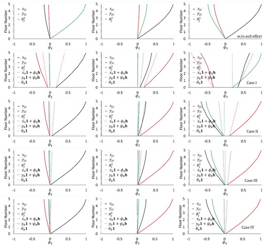 and are defined in Equation (4) by the time variations in and . In the analysis, the vertical motion of the ground was not in use. The force distribution can be expressed with the sum of the modal inertia forces, as given in Equation (4). and are and diagonal matrices for both buildings, respectively. , , and in are subvectors of the natural vibration mode in the superstructure, sized as . They are related to the displacement in both directions and the rotating DOF. , , , and in are five subvectors of the mode shapes of the SSI system for Building A. With generalized modal co-ordinates for both buildings, the undamped modal displacement responses, and , can be redefined as