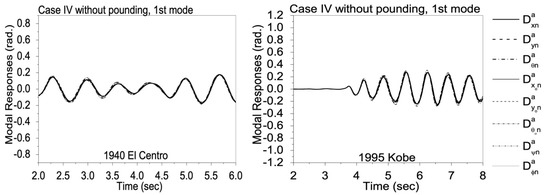 In Case IV, the modal responses for the eight DOFs display a similar pattern to those of the second and third modes. Case I shows that the modal responses for the first three modes are mainly affected by SSI effects, and they are out of phase. Figure 6 shows the response of the first mode in Case IV without any pounding.
