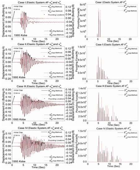 For Cases I and II, excellent agreement between the peak and phase responses for both methods has been found for the selected earthquakes. Notably, both methods produced slightly different response histories for the fourth story due to the larger forces under the small SSI effects, as shown in Figure 7. As a result of the high pounding forces in the first through third modes, the responses at the foundation obtained by the rigorous method in Figure 8 are not fully in agreement with those achieved by the approximate method in Case IV. Based on the comparison between the conventional rigorous method and the approximate method, it could be concluded that the approximate method markedly improves the accuracy of the analytical results without increasing the computational effort and by reducing the dimensions of the matrix.