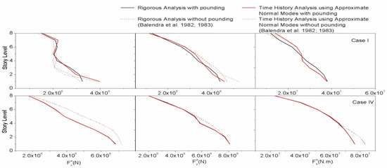 Maximum shear and torque of an eight-story building in Cases I and IV for the effects of pounding during the 1940 El Centro earthquake [42,43].