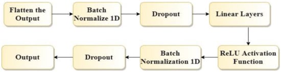 Fully connected layers were applied to the original output of our proposed model. Fully connected layers include the following components, as shown in Figure 3. First, we flattened the output using the flatten method of Pytorch. Then dropout was used. After that, a linear layer for reducing the dimensions of the output was applied. Finally, the ReLu activation function was used.