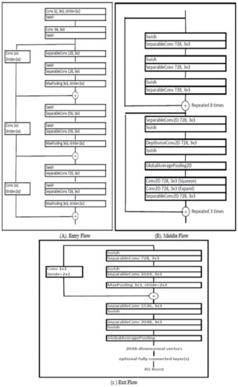 Figure 4 shows the architecture of our proposed model. We divided our architecture into three parts, namely Entry Flow, Middle Flow, and Exit Flow. Data enters the entry flow, passes through all the layers of each block, enters the first block of the middle layer which gets repeated eight times, then enters the second block of the middle layer which gets repeated three times. The middle layer is also known as the feature extractor layer. The output of this layer is loaded into Exit Flow, from where we get the final output.