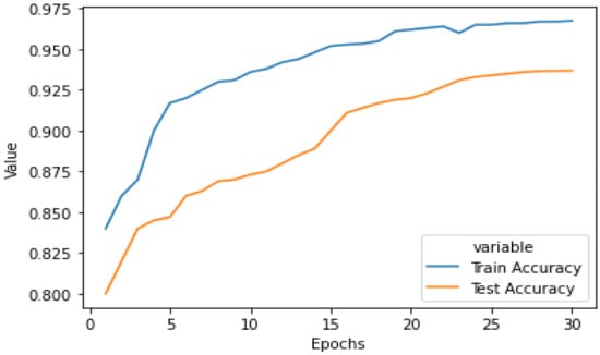 Figure 9 shows the graphical representation of the performance of our model with the increase in number of epochs. This graph shows both training as well as testing accuracy of the model on the augmented dataset. It is evident from the graph that performance was better on the training dataset; however, as we can see that the difference in performance is not large, we can say that our model does not suffers from an overfit problem. Our model is generalized and performs well on unseen data with an accuracy of 93.28%.