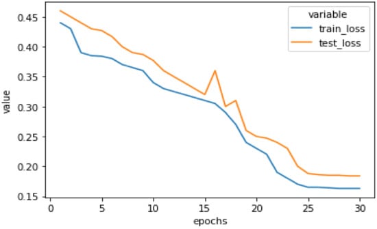 Figure 10 shows the training and testing loss of our model on the augmented dataset. It can be easily visualized from this graph that the difference between the training loss and testing loss is small, which results in the conclusion that our model is not remembering the training data, but learning from it. After executing our model for 30 epochs, testing loss was 0.1865 whereas training loss dropped to 0.1623.