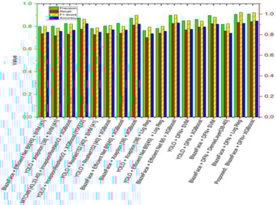 Figure 11 shows the comparison of the performance of our proposed model architecture graphically in terms of precision, recall, and accuracy. These results were obtained from the testing data of our dataset.