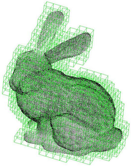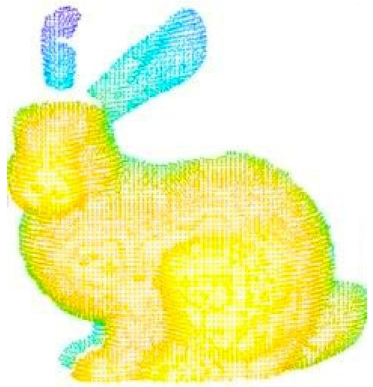 The accuracy of feature extraction is related to the speed and accuracy of subsequent registration. Figure 2 is a schematic diagram of the original point cloud data, which can be used to extract feature points. Using a single feature point extraction method such as the voxel down sampling method, although the point cloud data are simplified, it cannot keep the local features of the point cloud. The internal shape signatures (ISS) feature point extraction method can preserve the local features around the point cloud data; however, the internal points are missing due to the calculation method, as shown in Figure 3. Due to the principle of simplification, the simplified curvature algorithm has low efficiency and a large amount of calculation. In this paper, octree sampling and ISS feature point extraction are combined to extract feature points. Octree is an efficient way to organize point cloud data. The data are divided by cyclic recursion until the maximum recursion depth is reached. Figure 4 is the schematic diagram of the point cloud octree, Figure 5 is a schematic diagram of octree sampling results. In this paper, the octree sampling method is used to simplify the point cloud data for the first time, and the important data such as the shape and features of the point cloud are retained. Then, the ISS feature point algorithm is used to further retain the surrounding data so that the local features of the point cloud can be well preserved. Stanford bunnies were sampled according to this method, and the results are shown in Figure 6. The flow of the improved algorithm is as follows: