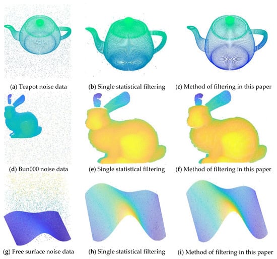 This paper uses the teapot point cloud data set, Stanford bunny point cloud data set, and free-form surface data set for verification. There are 4,000 random noise points in each of the three point cloud data sets. Through the following experiments, we can see the difference between using a single statistical filtering method and the filtering algorithm used in this paper. The experimental results are shown in Figure 8.