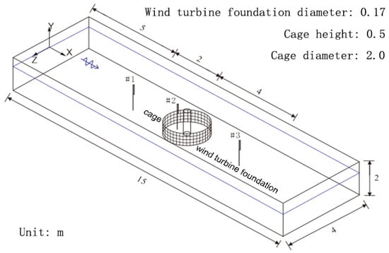 A scale model of 1:30 is used for numerical simulation. Figure 3 implies an established numerical wave flume with a length of 15 m, a width of 4 m, and a height of 2 m. The diameter D of the cage is 2 m, while that of the wind turbine foundation is 0.17 m, placed in the center of the bottom of the sink. The cage height H is 0.5 m, the length of the wave-making area is 4 m, and the length of the wave-absorbing area is 5 m. Three wave height meters are arranged in front, inside, and behind the combined structure along the x-direction of the center line.