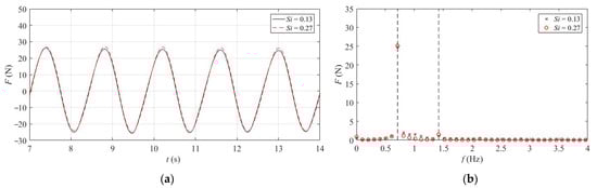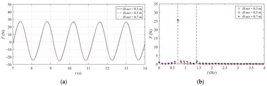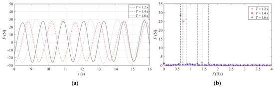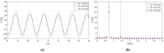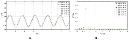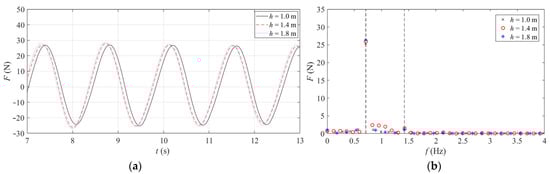Figure 5, Figure 6 and Figure 7 depict the time domain curve and frequency domain diagram of the combined structure under different wave heights, periods, and water depths. It can be seen from the comparison that the horizontal wave load on the combined structure increases with the increase in wave height. The change of wave period has little effect on the horizontal wave load on the combined structure, whereas with the variation of water depth, the horizontal wave load on the combined structure increases slowly, and the wave crest occurs slightly earlier. In the frequency domain diagram, one times the frequency is inertial force, and two times the frequency is drag force. The analysis illustrates that the inertial force dominates among the three, while the drag force is weak.