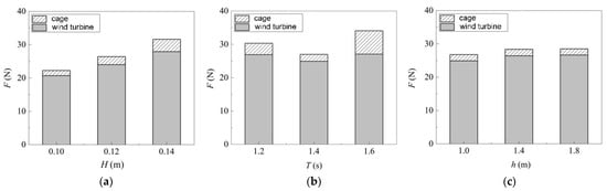 In the composite structure, the sensitivity of the horizontal load on cages and wind turbines to the change of wave factor is different. In order to explore the influence of different wave factors on the safety of the combined structures, Figure 8 is the distribution diagram of the hydrodynamic load of the combined structure under different wave heights, wave periods, and water depths. Table 2 shows the proportion of the maximum horizontal load on the wind turbine foundation.