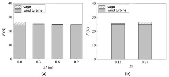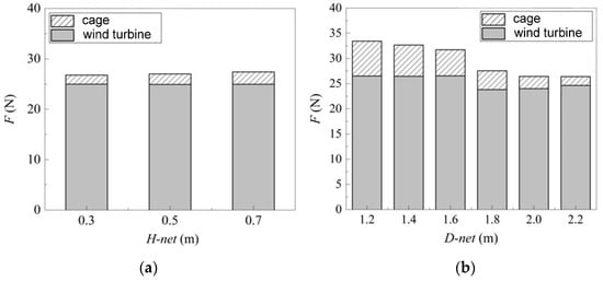 The fish yield in the fish cage is affected by the dimensions of the cage. However, the dimensions of the cage are also determined by the power supply of the wind turbine. In addition, the hydrodynamic load on the fish cage can be also transferred to the foundation of the wind turbine. Thus, it is beneficial to understand the influence of the geometrical dimensions of the fish cage on the safety design of the combined structure. The diameter and height of the cage are important factors to be considered when designing cage dimensions. Three different cage heights and six different diameters of the cages are set in this paper, and the specific design parameters are shown in Table 3. The wave height is 0.12 m, the period is 1.4 s, the water depth is 1 m, and the cage is commonly at the liquid level.