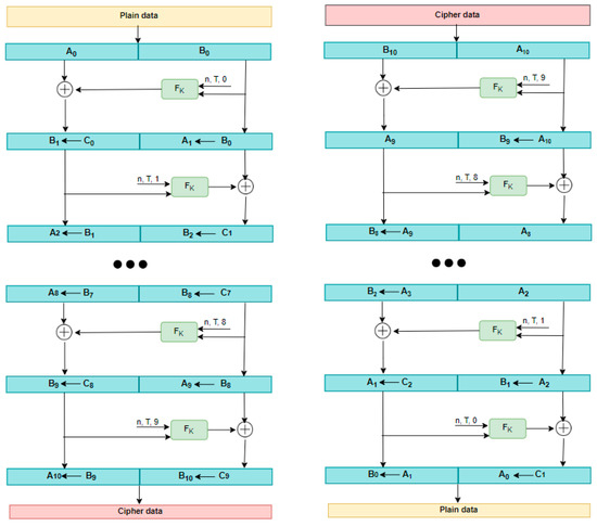 A Feistel structure is created when reversible transformation is repeated numerous times, known as “rounds”. The transformation is divided into three phases. First, data is divided into two segments, and a keyed function named the round function is applied to one segment of the data. For the next round, the roles of the two parts are switched to alter another segment of the data. The function F generates a repeatable hash-like value by using a user-specified symmetric block cipher. Figure 1 below shows the framework for both encryption and decryption for ten rounds, although FF1 and FF3-1 have ten and eight rounds, respectively.
