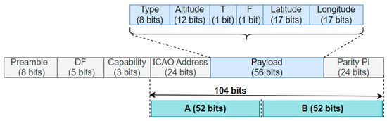 Figure 2 illustrates the structure of the airborne position message. The downlink format (DF), capability (CA), ICAO address, payload, and parity identity (PI) are the five fields that make up the 112 bits (14 bytes) [26]. The DF field, which has a constant value of 17, describes the message format (10001 in binary). These bits do not undergo encryption, allowing position reports to be recognized in every message. The other fields may be secured. To make it simpler to provide byte-aligned input, the downlink format and capability fields remain unencrypted, since they are constant in airborne mode [12]. Fifty-two (52) bits are equally distributed across the A and B parts of the message and can be used as a Feistel-based encryption function. However, encrypting the ICAO address field is also proposed as a possible solution to conceal information by disconnecting the link between the ICAO address field and other fields [24].